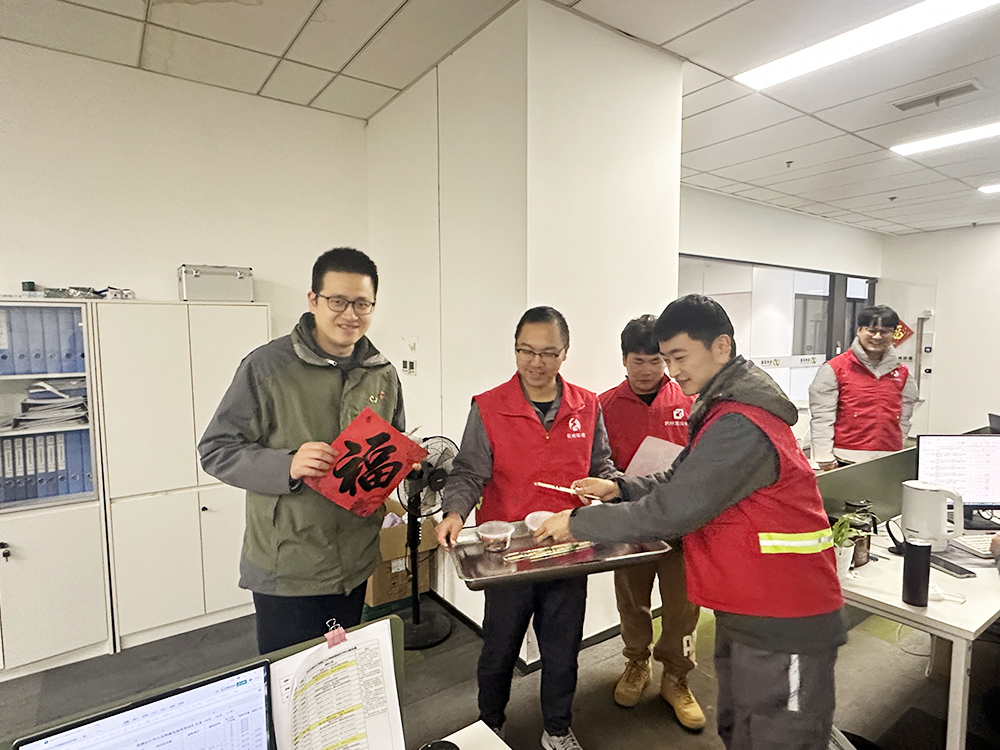 臘八節前夕,臨江食堂的工作人員已經在廚房里忙碌起來,他們分工合作,精心挑選食材,用心熬制,分裝打包。今天一大早,黨團員志愿者們身著紅馬甲,帶著這份心意走進兩個運行中心,現場為大家發放臘八粥,并送上寄托著新年美好祝愿的“福”字。
