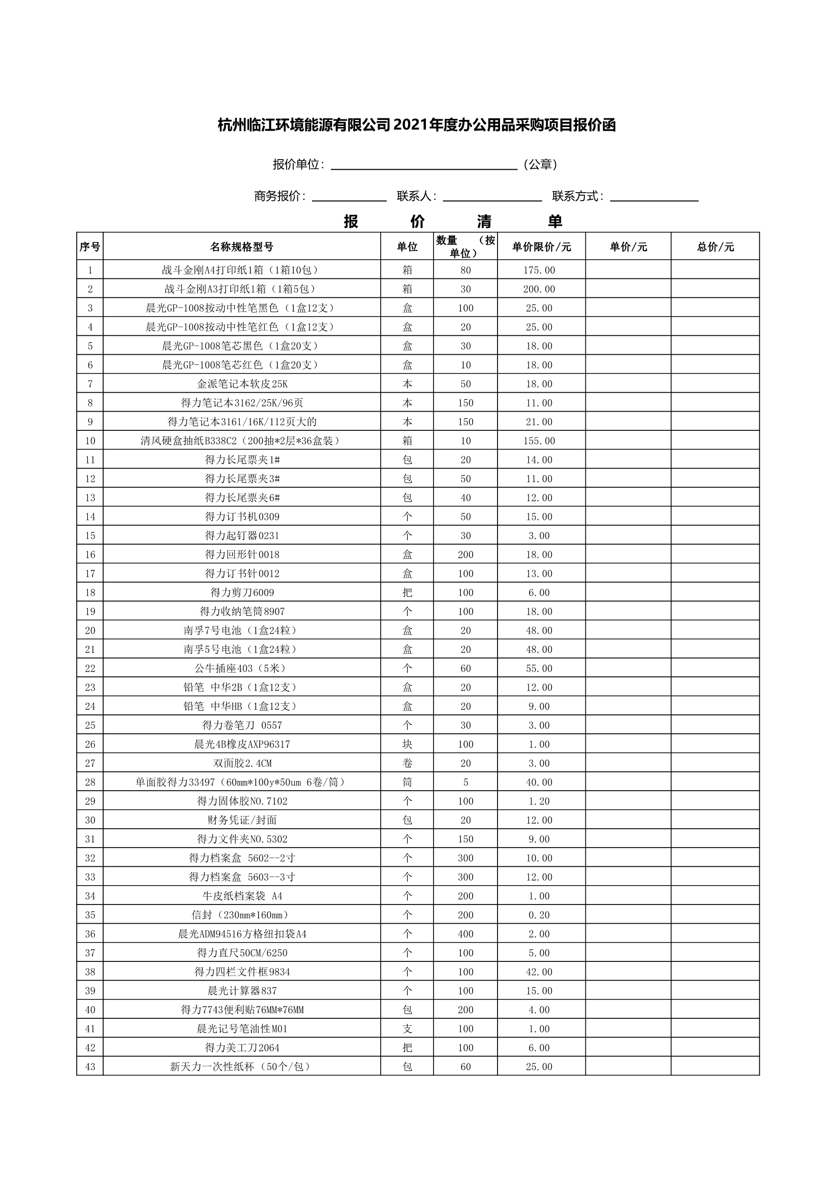 杭州臨江環境能源有限公司2021年度辦公用品采購項目報價函.xlsx