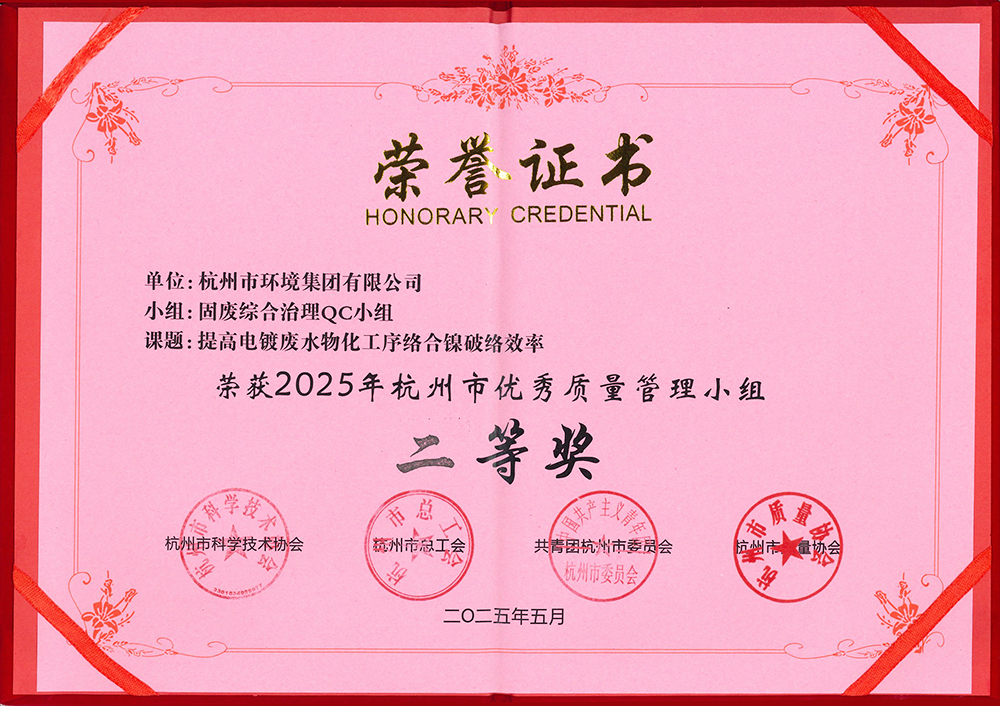 5月27日-30日,由杭州市科學技術(shù)協(xié)會、杭州市總工會、共青團杭州市委員會和杭州市質(zhì)量協(xié)會聯(lián)合舉辦的2025年杭州市優(yōu)秀質(zhì)量管理小組成果發(fā)布會評比活動在千島湖舉行,臨江公司固廢綜合治理QC小組成果《提高電鍍廢水物化工序絡(luò)合鎳破絡(luò)率》通過現(xiàn)場路演、專題匯報、專家評審答辯在近400個課題組脫穎而出,榮獲2025年杭州市優(yōu)秀質(zhì)量管理小組二等獎。