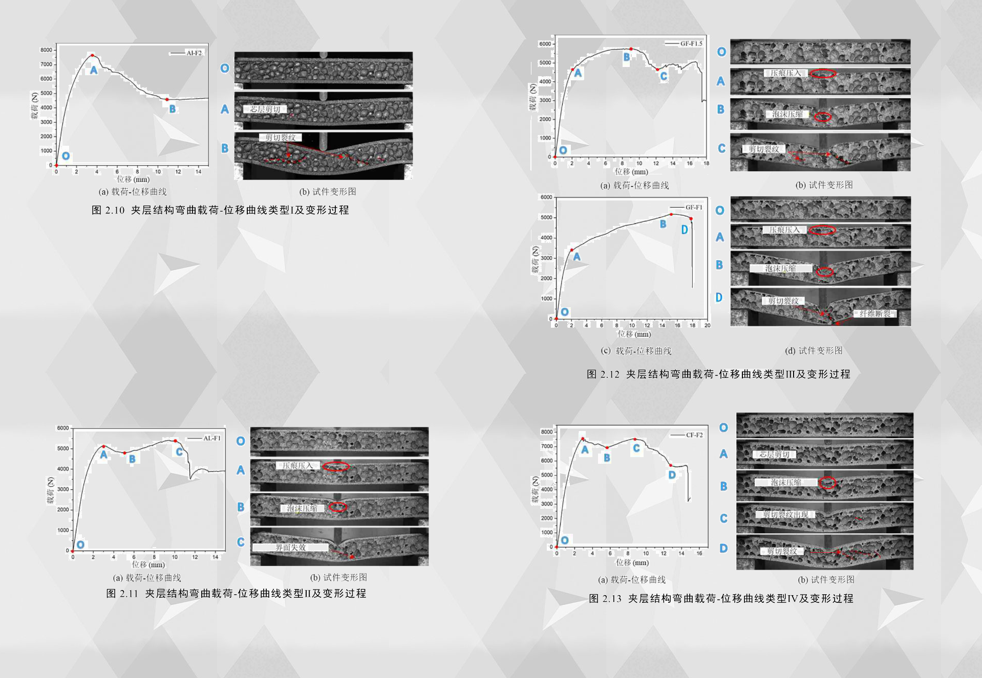 為了研究臨界失效模式對后繼載荷-位移曲線和后屈曲變形的影響,圖2.10-2.13展示了泡沫鋁夾層結(jié)構(gòu)三點彎曲的幾種典型荷載-位移曲線及其變形時刻圖,本章中的曲線與以往的相關(guān)研究有一定的差異,這些載荷-位移曲線沒有明顯的面板拉伸以及在初始失效模式之后的后續(xù)硬化行為,這是由于在實驗過程中夾層結(jié)構(gòu)試件與試驗夾具的夾持端之間存在相對滑動。根據(jù)夾層結(jié)構(gòu)的臨界失效模式和載荷-位移曲線分析可知,具有相同面板材料但不同臨界失效模式夾層結(jié)構(gòu)的荷載-位移曲線差異很大,并且具有相同臨界失效模式但面板材料不同的夾層結(jié)構(gòu)之間荷載-位移曲線也有一定差異,因此根據(jù)面板材料和曲線形狀不同可以將泡沫鋁夾層結(jié)構(gòu)準靜態(tài)彎曲試驗的載荷-位移曲線分為四類,分別為類型I、Ⅱ、Ⅲ和IV,載荷-位移曲線類型I和Ⅱ為鋁合金夾層結(jié)構(gòu)所特有,類型Ⅲ和IV 為纖維增強夾層結(jié)構(gòu)所特有,各曲線類型的特點及臨界失效模式分析如下: