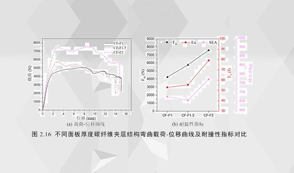 2.16(a)比較了不同面板厚度碳纖維夾層結(jié)構(gòu)的載荷-位移曲線,可以發(fā)現(xiàn),CF-F1的載荷-位移曲線屬于曲線類型Ⅲ,而其臨界失效模式為壓痕壓入(IN);由于碳纖維在拉伸過程沒有明顯的塑性變形,當其開始失效時,后續(xù)載荷的變化趨勢與臨界載荷為IN的鋁合金夾層結(jié)構(gòu)有一定的差異,CF-F1開始失效時,載荷并沒有下降,只是增加的幅度大大地減少。CF-F1.5和CF-F2的臨界失效模式為芯層剪切失效(CS),二者達到臨界載荷之后載荷有所降低,兩者的載荷-位移曲線屬于類型IV。與CF-F2不同的是,CF-F1和CF-F1.5其后期壓潰力的大小變化趨勢相對平緩。試件整體斷裂前(14-16mm處)的變形模式主要存在芯層泡沫壓縮、剪切裂紋和界面失效,隨著位移的增加,面板纖維發(fā)生斷裂,試件失去承載能力。