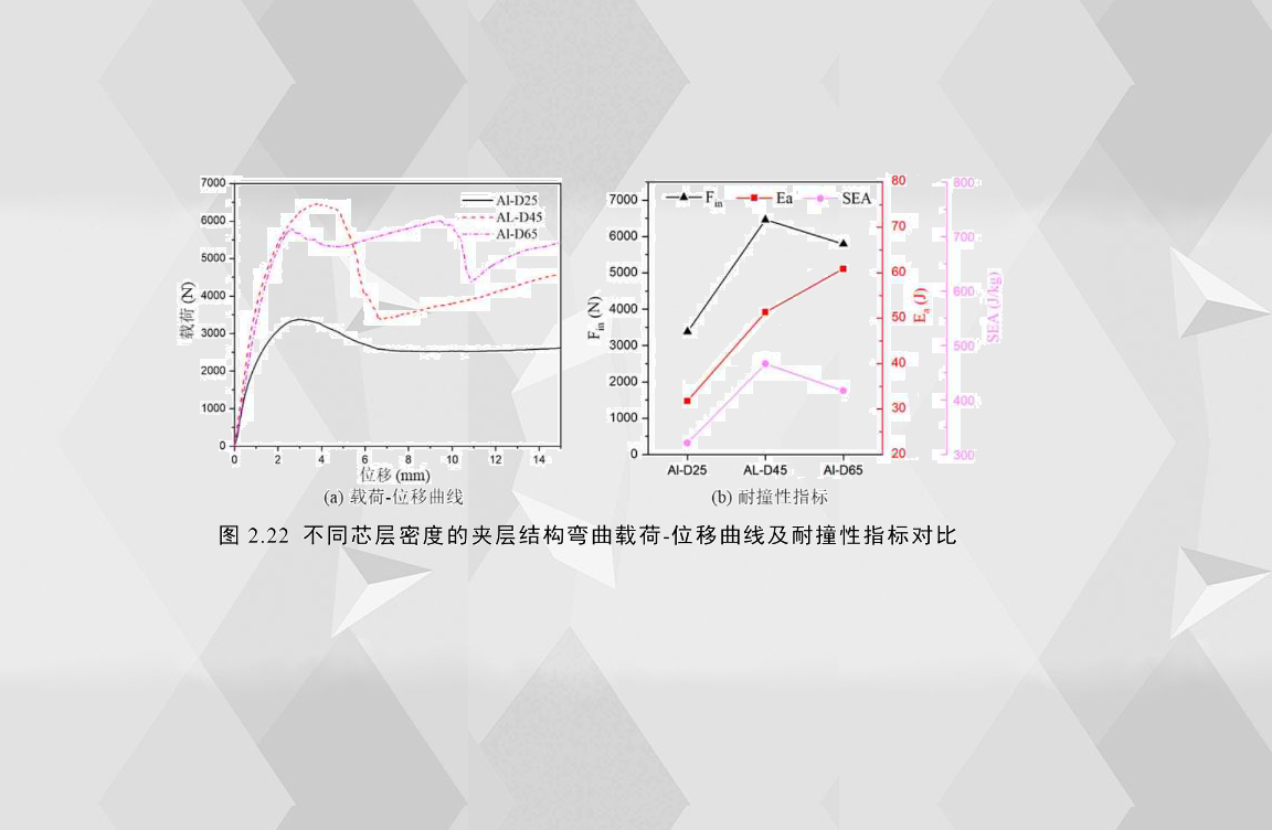 對不同芯層密度的鋁合金夾層結(jié)構(gòu)而言,其載荷-位移曲線和壓潰過程差別較大,如圖2.22(a)所示,芯層密度為0.25g/cm3的AL-D25和芯層密度為0.45g/cm3AL-D45的載荷-位移曲線屬于類型I,芯層密度為0.65g/cm3的AL-D65的屬于類型Ⅱ,AL-D25的臨界失效模式為芯層剪切(CS),臨界載荷最小,由于其芯層密度較低,其后期主要失效形式還是以剪切裂紋為主,后屈曲壓潰力與臨界失效載荷相比相差不大。AL-D45的臨界失效模式也為芯層剪切(CS),其臨界載荷是三者中最大的,在臨界失效之后小段位移耦合了下界面失效,其載荷下降很快,嚴重降低了試件吸能。值得注意的是,雖然AL-D65的芯層密度比AL-D45的大,芯層可以承受的剪切強度大,但AL-D65的芯層的平均胞元大小比AL-D45的小,界面的強度比AL-D45的小,而在加載過程AL-D65的界面能承受的剪切強度比芯層能承受的剪切強度小,所以發(fā)生了界面分離的臨界失效模式,使得AL-D65的臨界載荷反而比后者的小。雖然AL-D65在彎曲位移2.5mm左右處發(fā)生界面失效,但其失效界面的位置為上膠層,位移相對較小,試件整體的承載能力還很強,所以其載荷下降的幅度比例相對AL-H10更小,所以前者的吸能效果更佳。