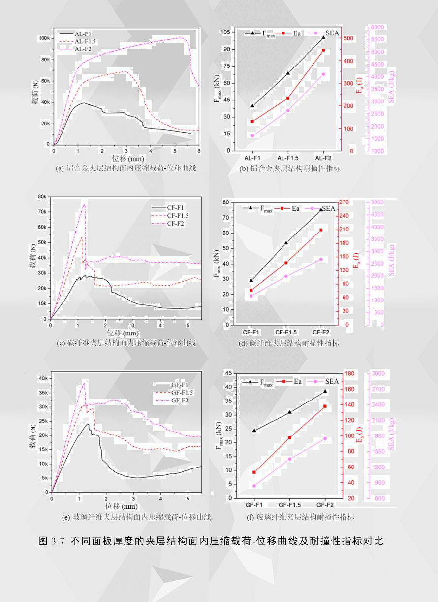 為了研究面板對泡沫鋁夾層結構面內壓縮性能的影響,對三種不同面板材料以及三種不同面板厚度的泡沫鋁夾層結構進行了準靜態面內壓縮試驗測試。從圖3.7中可以看出,面板厚度對夾層結構面內壓縮的影響顯著,就鋁合金夾層結構而言,隨著面板厚度增加,載荷-位移曲線的第一階段位移量沒有明顯增加,但曲線的斜率變大,即剛度增加;曲線第二階段面板的屈曲位移量隨面板厚度的增加而明顯變大,而鋁合金夾層結構面內壓縮的吸能主要靠第一階段和第二階段,特別是第二階段的塑性變形,因此,其總吸能隨面板厚度的增加而大幅提高;由于第三階段后期面板處于屈曲狀態,其承載能力主要由泡沫芯層擔任,所以此時載荷雖隨面板厚度增加而略有提高,但提升的幅度較小。對纖維增強夾層結構而言,與鋁合金夾層結構相似的是,彈性階段的位移量基本未發生變化,只是剛度增加;第二階段的承載能力隨面板增加而顯著提高。通過比較各面板材料不同厚度的試件耐撞性指標,可以發現,隨著面板厚度的增加,夾層結構在面內壓縮工況下的峰值載荷、吸能和比吸能均會提高,即泡沫鋁夾層結構的耐撞性能隨面板厚度增加而明顯改善。